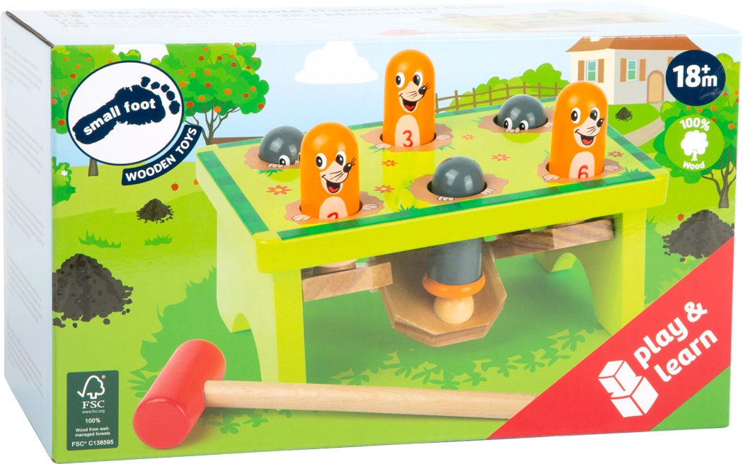 Тази дървена чукалка от SMALL FOOT превръща всеки ден в забавно „ловене“ на къртици в градината. Децата с помощта на дървеното чукче удрят къртиците и наблюдават как с радост изскачат от друга дупка. Простият принцип насърчава концентрацията и носи многократна забава.