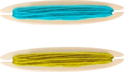 Четири дървени макари с цветна прежда и основни конци позволяват да започнете да творите без допълнителни покупки – просто разопаковайте и тъчете.