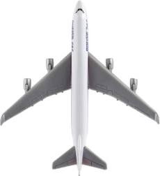 Този детайлно изработен модел на Boeing 747 (Jumbo Jet) комбинира издръжлив метал с висококачествени пластмасови части, което го прави отличен за ежедневна игра и като стилно допълнение към колекция от авиационни модели. Реалистичните пропорции, видимите двигатели и крила ще зарадват малки пилоти и запалени колекционери.