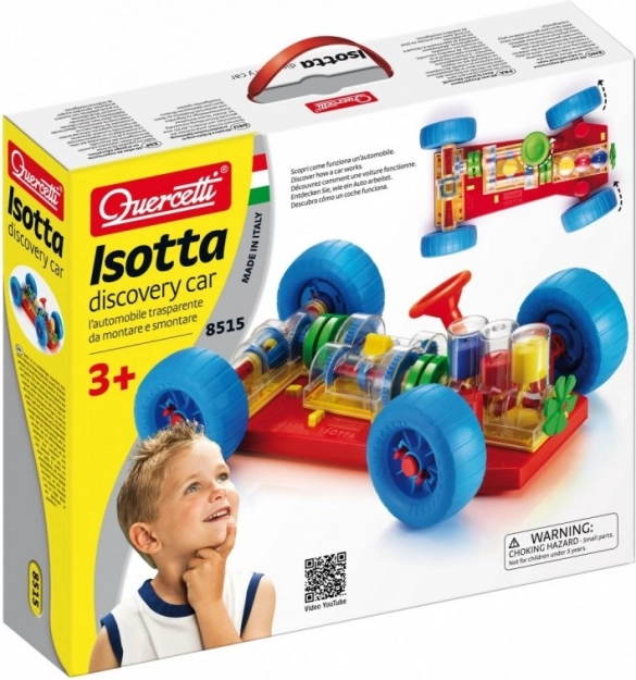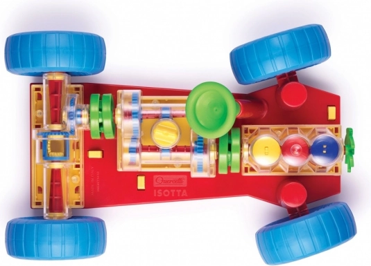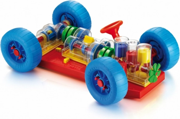 Изобретателна играчка, която приканва децата и техните родители да открият как работи едно истинско автомобилче. Всички основни механични функции са точно възпроизведени. При двигателя децата ще видят как работят цилиндрите и коляновият вал и как са свързани със скоростната кутия, която има работещо превключване с 3 положения (неутрална, 1-ва и 2-ра предавка). Диференциалът предава движението към задните колела и позволява те да се въртят независимо едно от друго. Всички механични части могат лесно да се прикрепят към шасито и също толкова лесно да се освобождават със специалните пружинирани жълти бутони. Воланът е функционален и позволява колата да завива или да влиза в паркинг. Децата могат също да повдигат колата отпред и отзад с помощта на специални колички, като завъртането на манивелата на предната от тях задвижва целия механизъм. При превключване на отделните скорости ще видят как се променя скоростта на движение на колелата и цилиндрите. При включване на неутрална ще забележат как двигателят и диференциалът се разединяват. Предназначено за деца от 3 години.