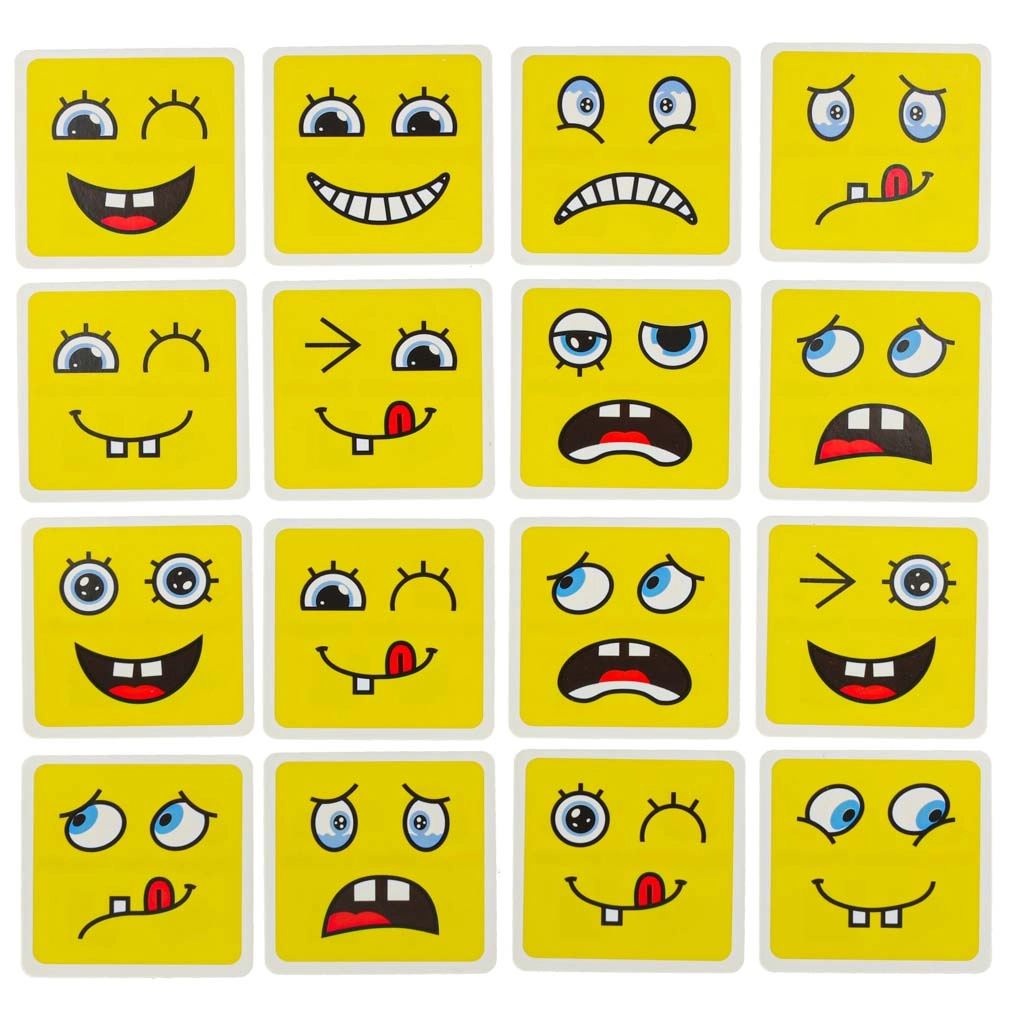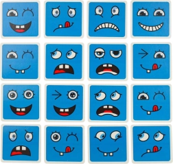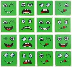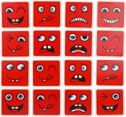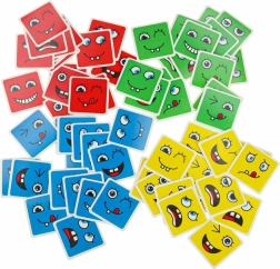 Забавна логическа игра за деца и възрастни, която развива разпознаването на емоциите, логическото мислене и фината моторика. Завъртете цветните дървени кубчета и по зададеното на картите подредете правилния израз на лицето – печели този, който направи най-много комбинации за най-кратко време. Безопасна дървена изработка, 64 карти с изражения и 16 кубчета в четири цвята за безкрайна доза забавление и учене.