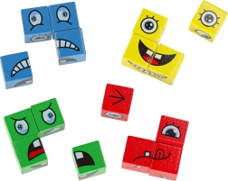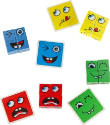 Гладко шлифовани кубчета с печат на очи и уста позволяват подреждане на десетки изражения. Здрави, безопасни и приятни за държане.