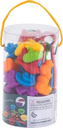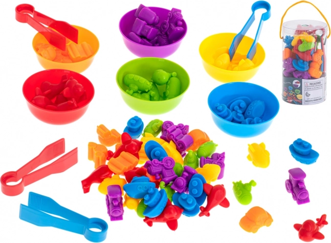 Този цветен комплект превръща първите стъпки в математиката в радост. Децата сортират превозните средства по цветове в купичките, броят, сравняват количества и изпълняват прости задачи. Включени са и пинсети, които естествено развиват захвата и координацията око–ръка.