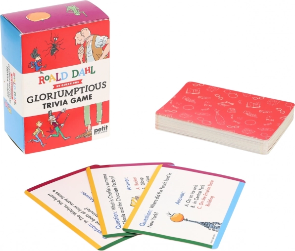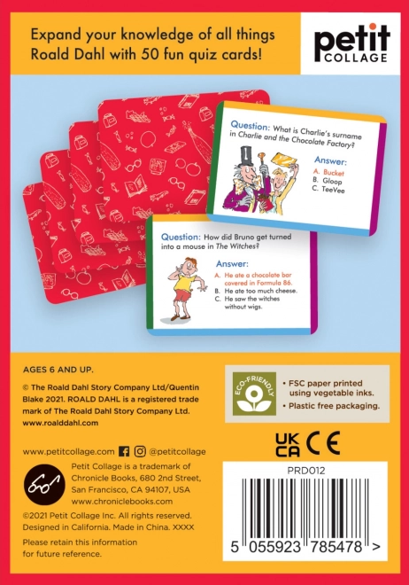 Станете майстор в историите на Роалд Дал благодарение на куиз картите, които проверяват паметта и познанията ви. Съдържат 50 карти с въпроси, които ще осигурят чудесно забавление за вас и вашето семейство у дома или в движение. Благодарение на илюстрациите на сър Куентин Блейк картите са и истинска наслада за окото. Изработени от 100% FSC сертифицирана хартия и отпечатани с растителни мастила, те покриват строги екологични стандарти.