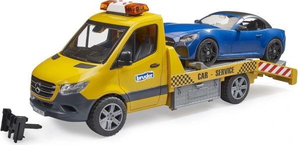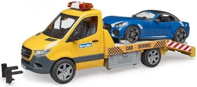 Камионът за пътна помощ BRUDER по модела на MB Sprinter впечатлява с детайлна изработка и богата функционалност. Децата ще харесат маяка със светлина и звук, реалистичната рампа с изтеглящи се релси и подпорни клинове, както и отваряемите врати и странични шкафчета. Част от комплекта е спортен кабриолет със сваляем покрив и сменяеми колела.