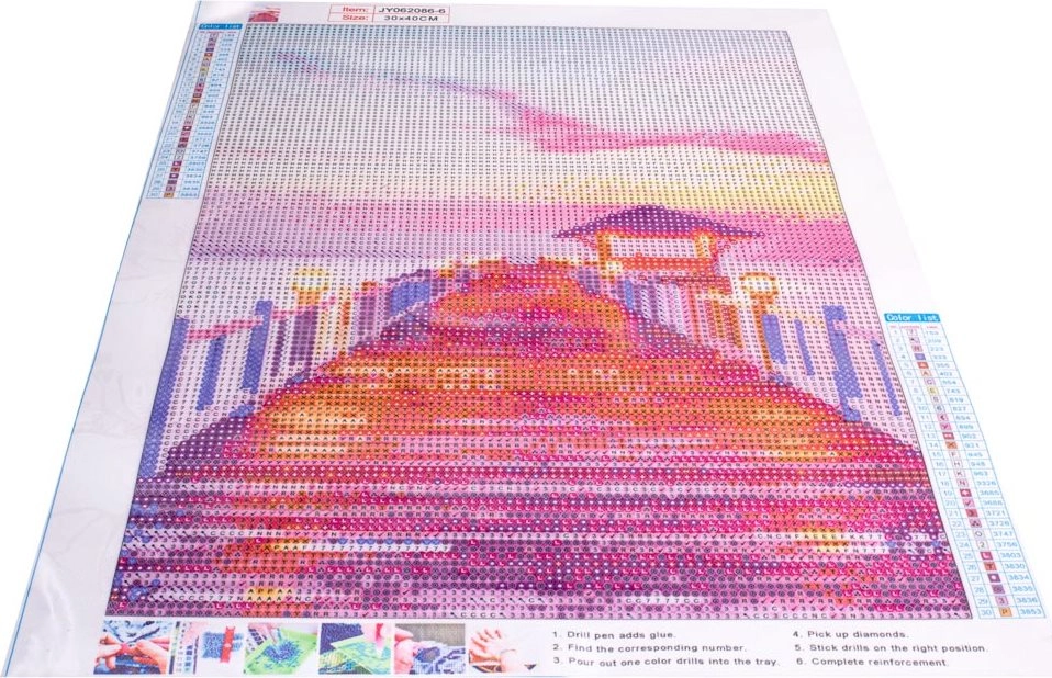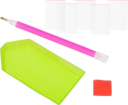 Комплектът включва цялата необходима принадлежност, от която се нуждаете, за да създадете уникална диамантена картина от удобството на вашия дом.