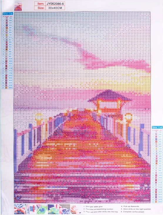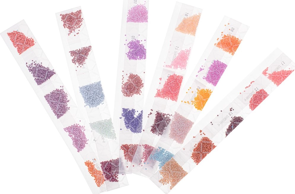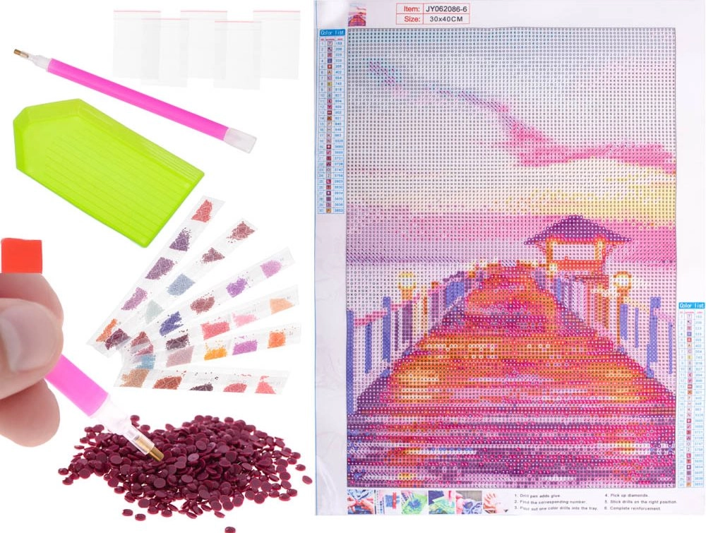 Комплектът включва отпечатано платно с лепкав слой, цветни камъчета в тридесет нюанса и качествени инструменти за апликиране. Благодарение на простата система за означаване по букви – всеки участък от платното съответства на определен цвят камъчета – създаването на мозайката е интуитивно и безпроблемно.