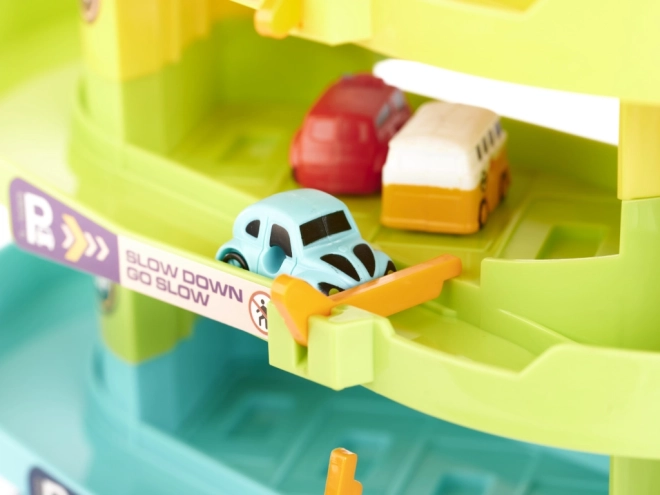 Открийте многофункционалния паркинг гараж, който превръща детската стая в оживен град. Четирите просторни етажа предлагат много място за паркиране, асансьорът издига количките до самия връх, а на покрива има и хелиодрум за любимия хеликоптер. Електрическият режим на асансьора е допълнен от весели светлини и мелодии, а при необходимост асансьорът може да се управлява ръчно.