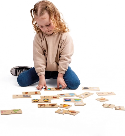 Децата съединяват картинки, които си подхождат като противоположни значения – например ден и нощ, топло и студено, тъжен и весел. Гладките, здрави елементи се държат и поставят лесно, така че малките ръце могат да се съсредоточат върху откриването на нови думи и връзки.