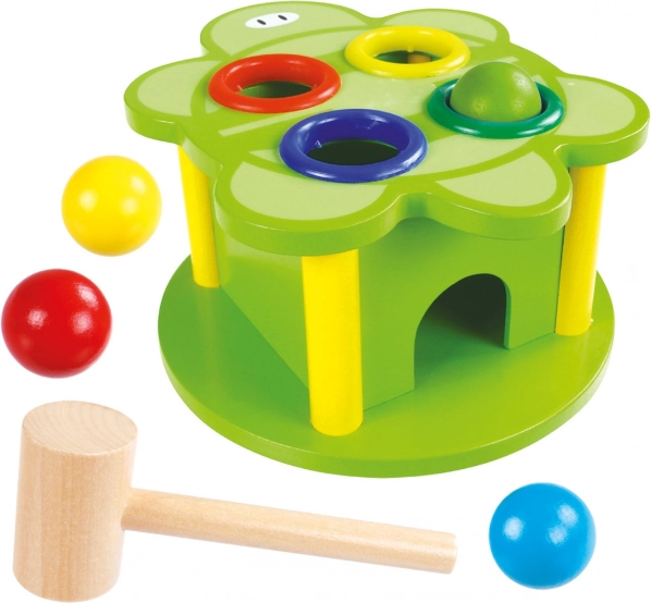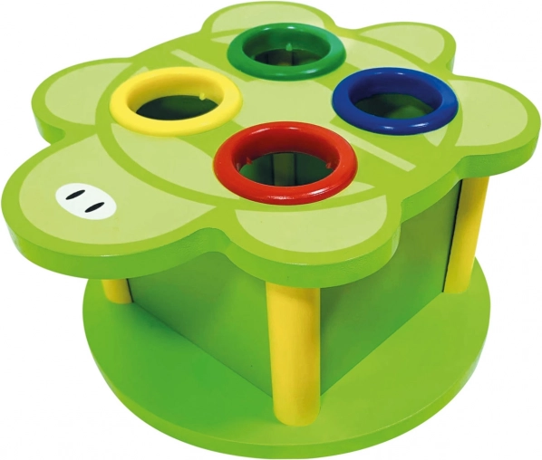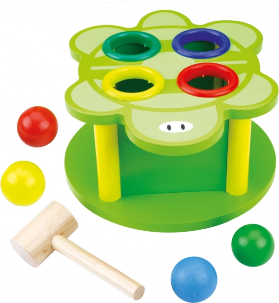 Забавна дървена игра с чукче във форма на костенурка с 4 цветни топчета, която подпомага при децата фината моторика, координацията око–ръка и разпознаването на цветовете. Здравата конструкция от масивно дърво издържа на години игра и е чудесен избор като подарък за деца от 3 години.