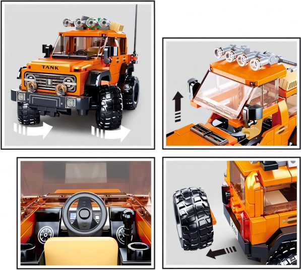 Открийте удоволствието от конструирането с офроуд автомобил, вдъхновен от американските SUV. Моделът в оранжево-черна цветова схема с масивни колела, багажник на покрива и детайлна предна решетка е идеален за динамични сценарии и за витрина на рафта. Благодарение на здравата ABS пластмаса конструкторът е издръжлив и безопасен.