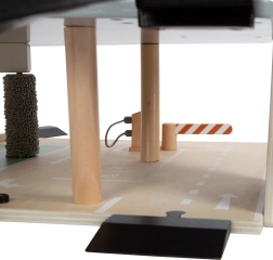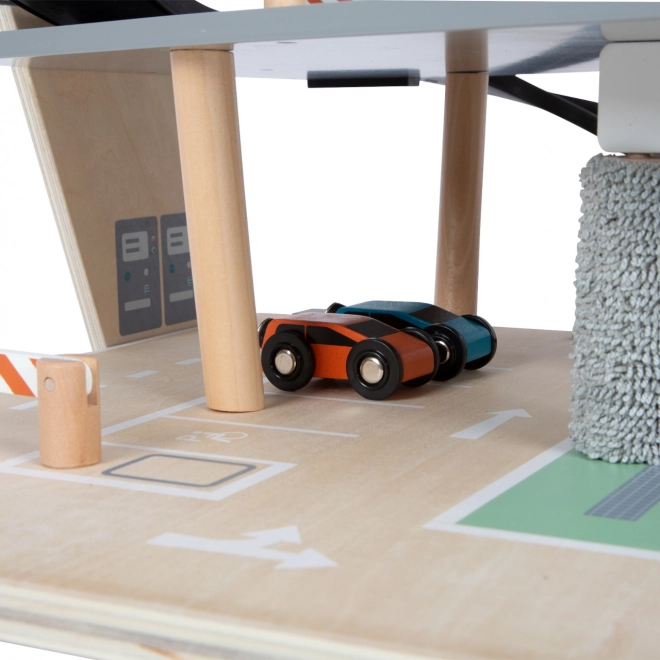 Това дизайнерско дървено състезателно паркинг гаражче предлага на децата богато оборудван игрови свят. Трите нива са свързани с работещ асансьор и две плавни рампи, които позволяват гладко движение на количките. Всяко ниво има механична бариера и гумено ограждение, което увеличава динамиката и предотвратява изпадането на автомобилите. Цветни икони и пътни знаци подпомагат ученето чрез игра и развиват въображението.