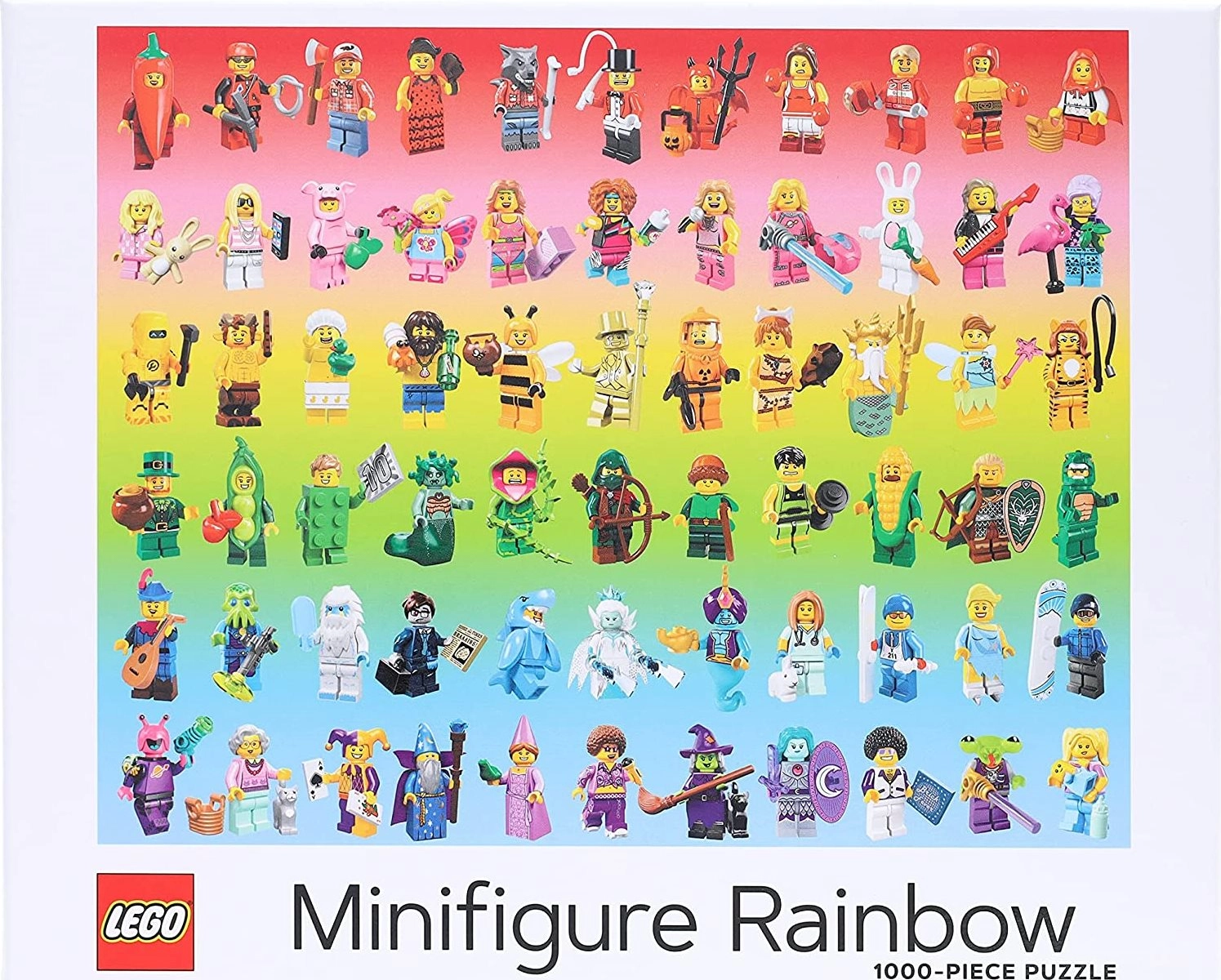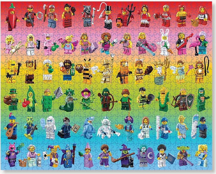 Този дизайнерски пъзел ще зарадва всеки фен на LEGO и почитател на цветните предизвикателства. Десетки уникални минифигурки са подредени по цветове, създавайки ефектен дъгов преход, който е удоволствие както да подреждате, така и да изложите. Качественият печат с безвредни бои и матовата повърхност осигуряват перфектна четливост на детайлите без отблясъци.