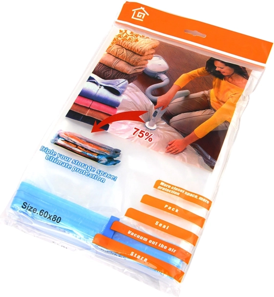 Вакуумният плик 60 × 80 cm моментално намалява обема на съхраняваните вещи и освобождава място в гардероба, куфара или скрина. Прозрачният дизайн улеснява ориентацията, а устойчивият материал и надеждният вентил задържат въздуха извън плика през целия период на съхранение.