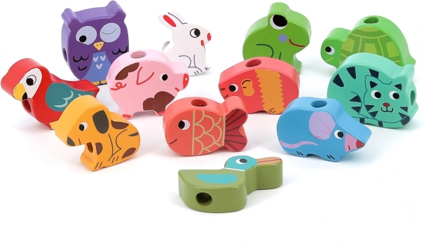 Низанката подпомага креативността и фината моторика, когато децата нанизват животинските мъниста на връвчето.