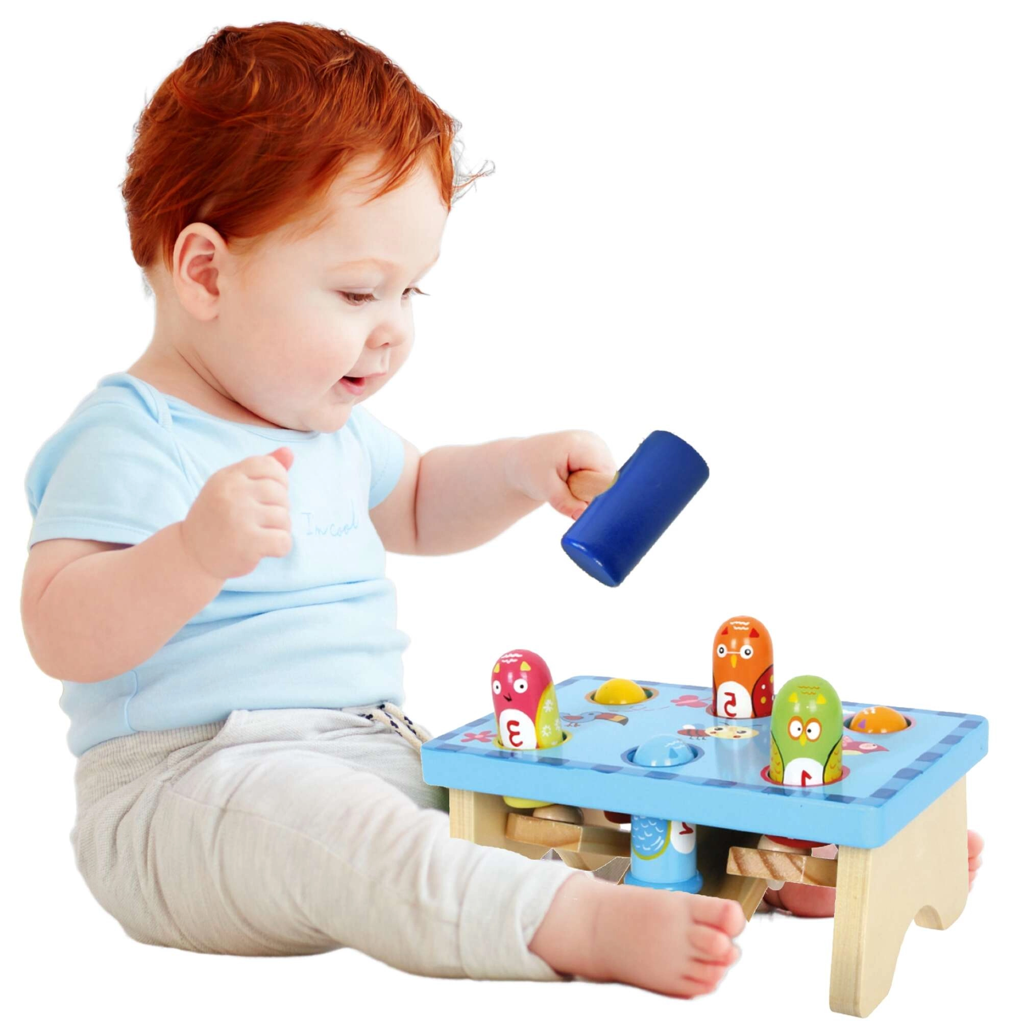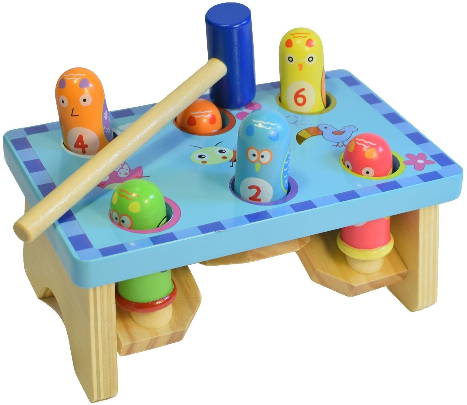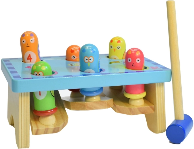 Благодарение на здравата изработка и ергономичното чукче децата упражняват фината моторика, координацията на движенията и търпението. Цветните и номерирани колчета помагат за разпознаване на цветовете и броене, така че играта естествено се съчетава с ученето.