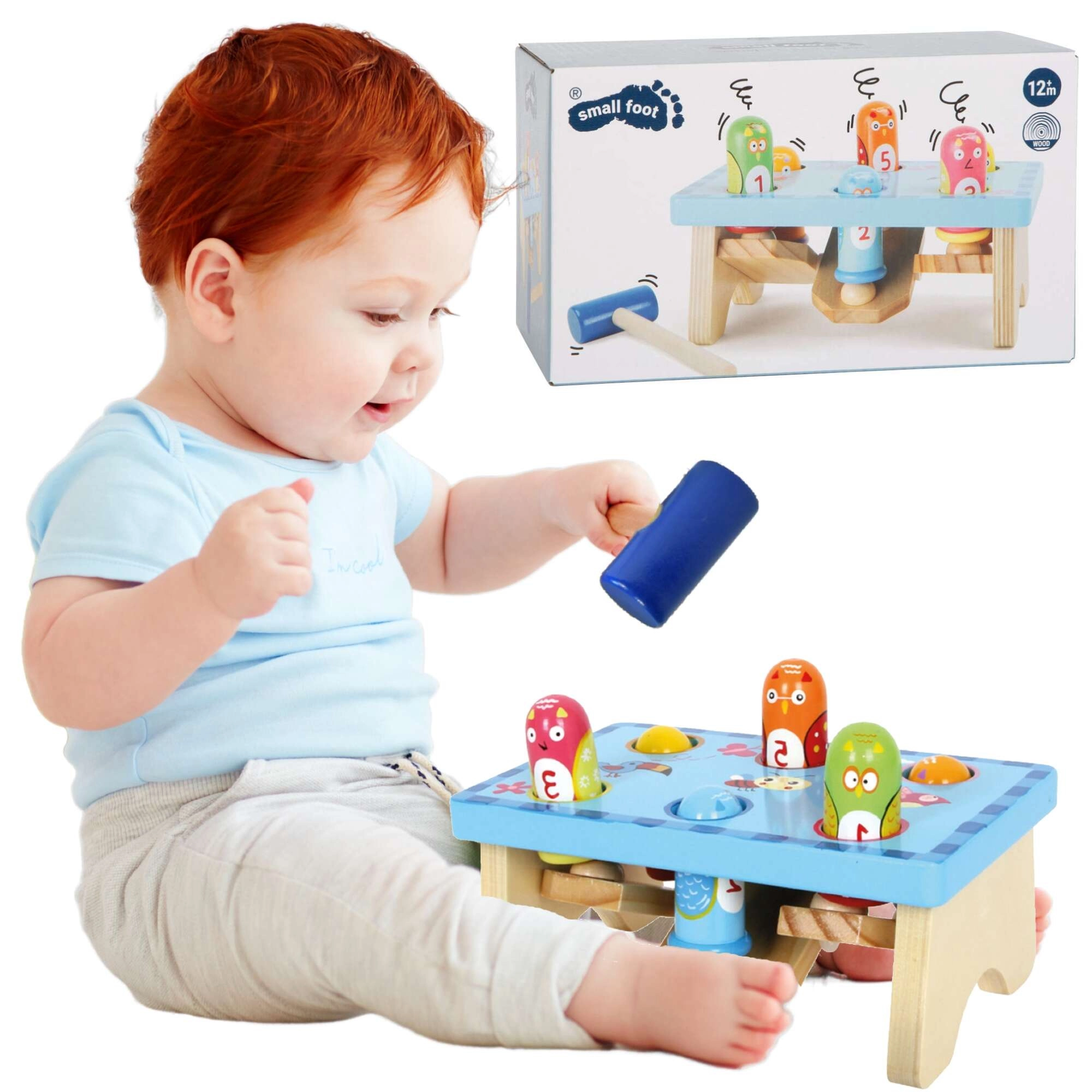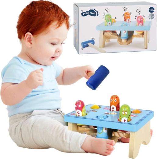 Забавна дървена ударна пейка от марката Small Foot с мотив на птички развива детската моторика и концентрация. Комплектът включва стабилна пейка в светлосин цвят, цветни колчета и дървено чукче. Играчката подпомага координацията ръка–око, точността на удара и ученето на цветове и числа, изработена е от качествено дърво и е подходяща за деца от 18 месеца.