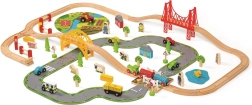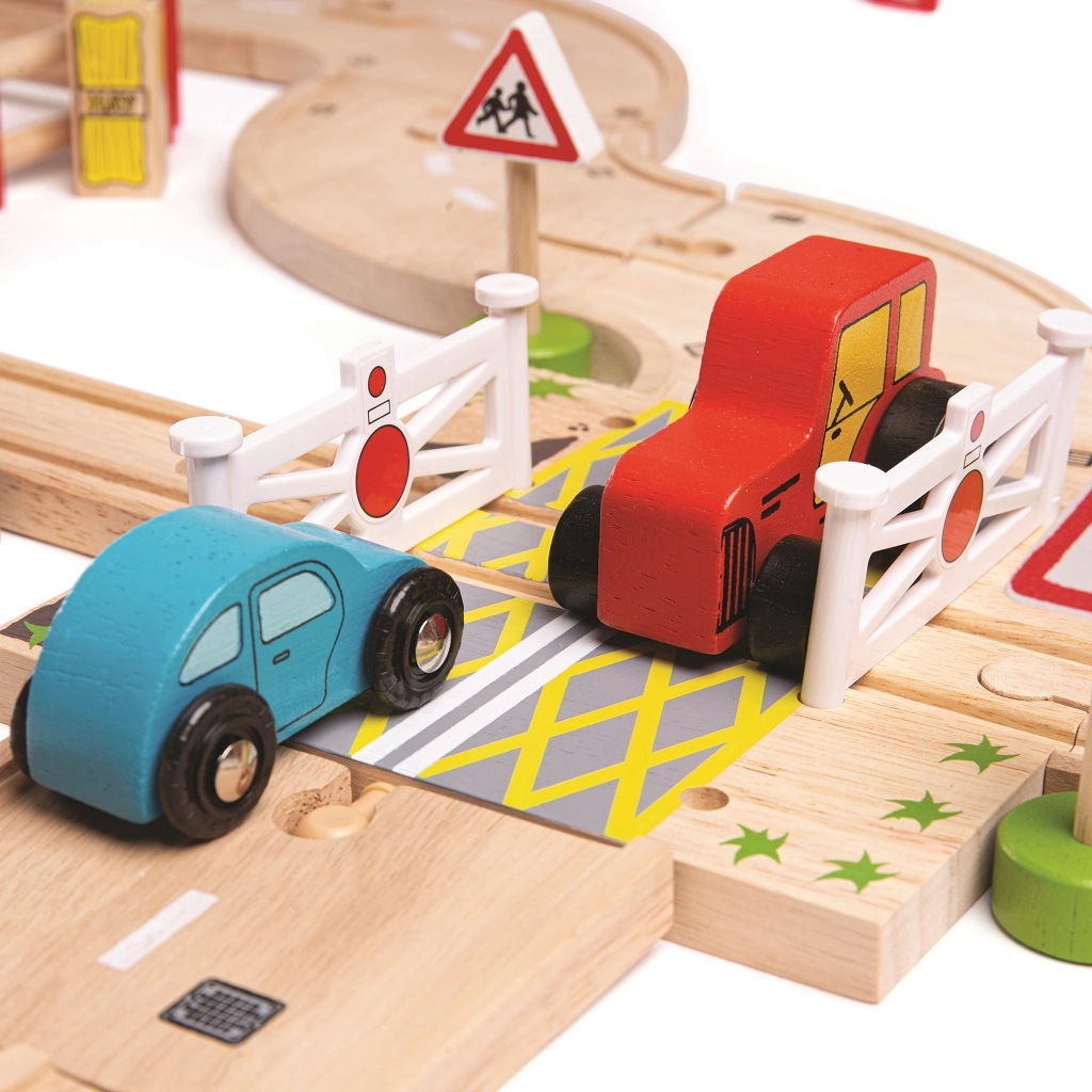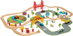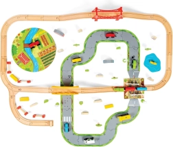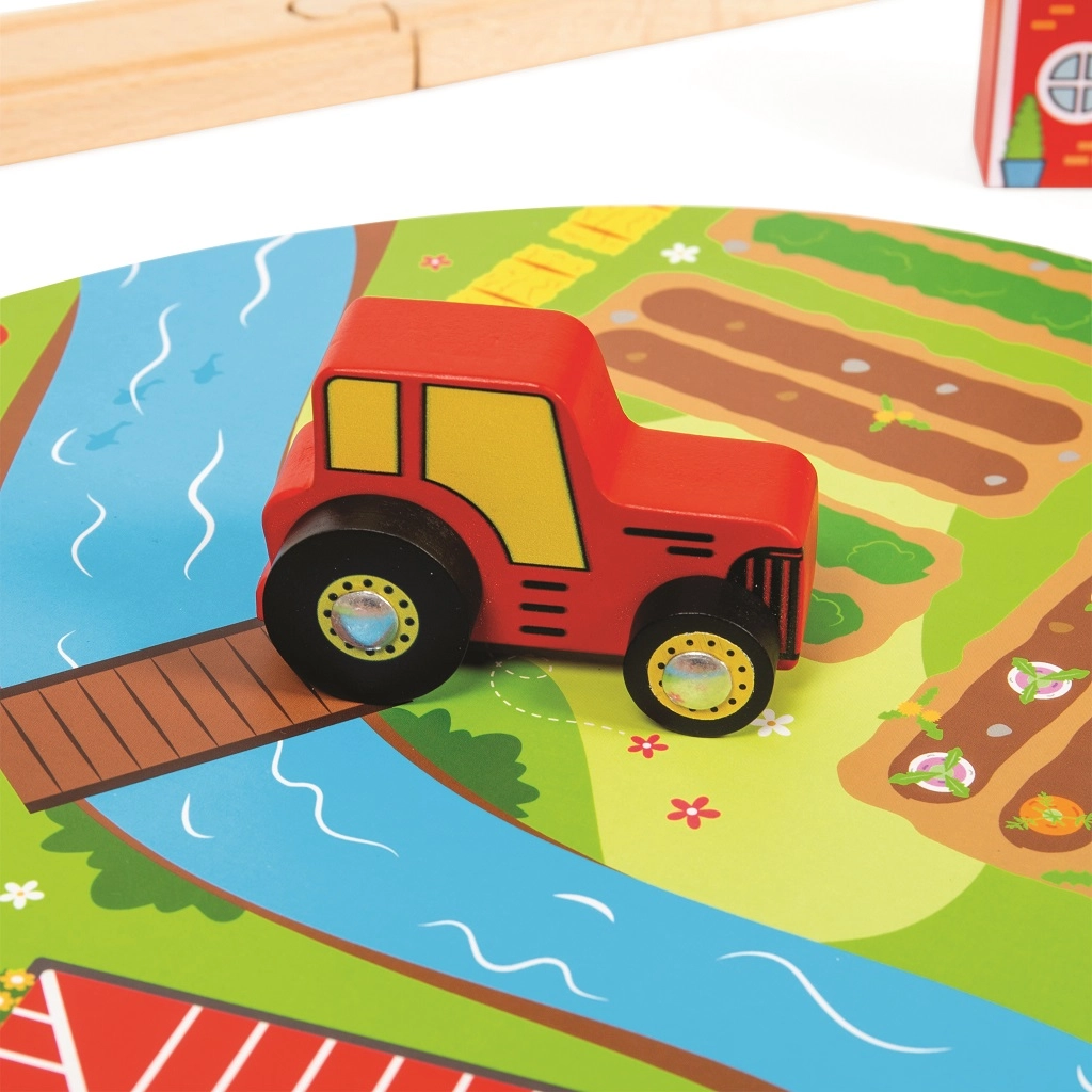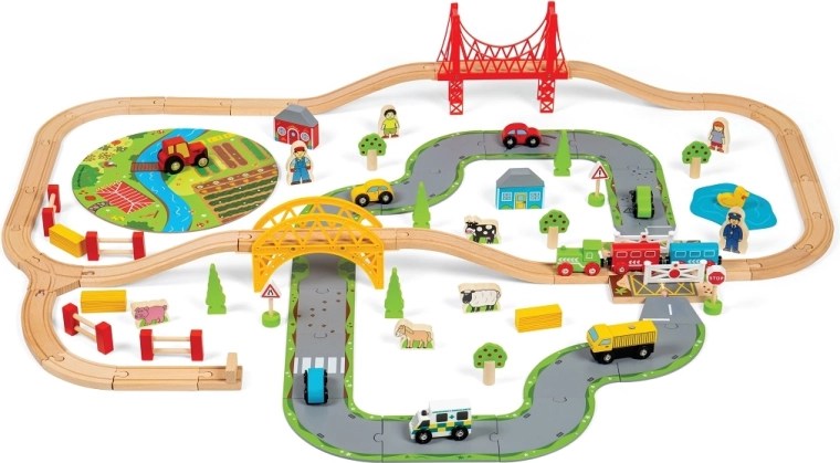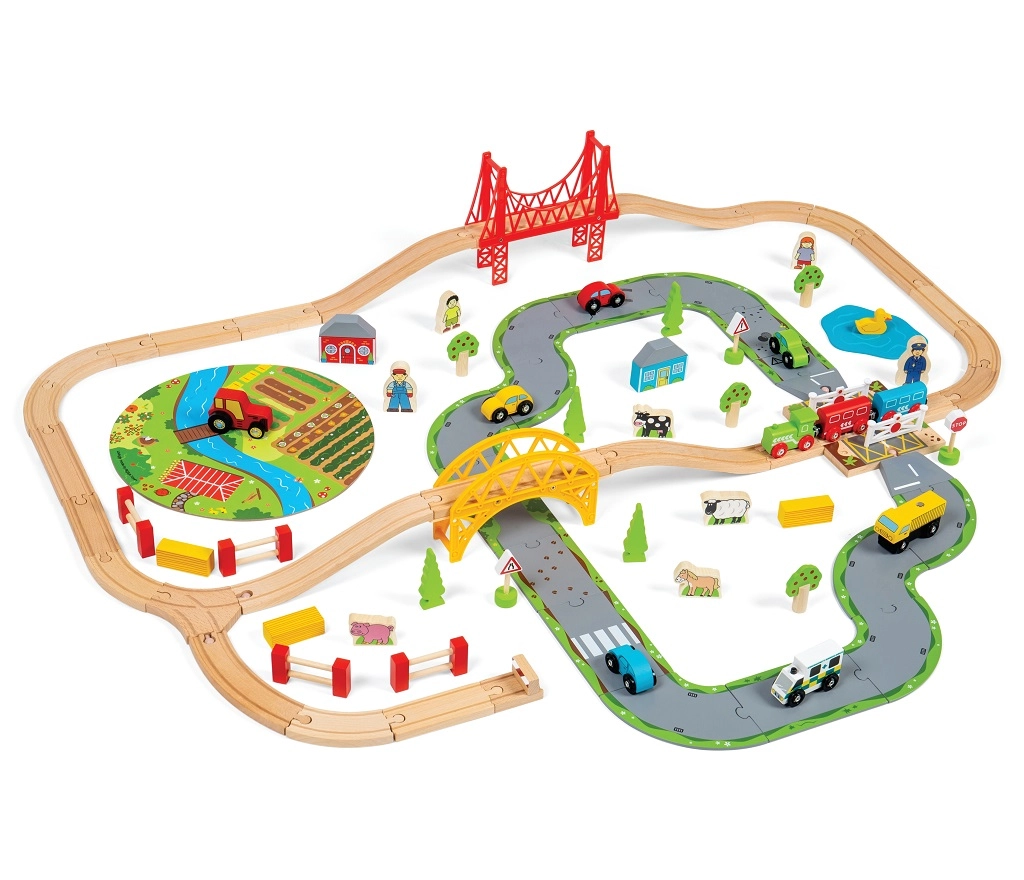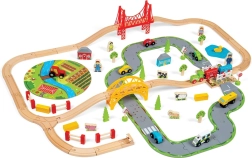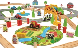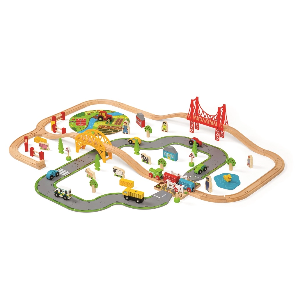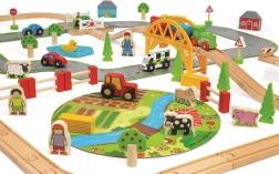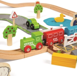 Тази дървена железопътна линия със селски път е перфектна комбинация от железопътна линия и автописта, които възпроизвеждат реалния транспортен свят. Благодарение на мостовете и прелезите вашите деца ще се потопят в свят, пълен със забавни приключения. Всичко е допълнено с местни аксесоари като ферма, сгради и дървета, които разкрасяват околната среда.