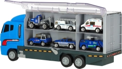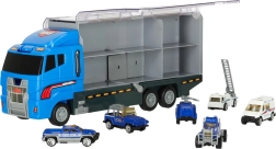 Голям син камион служи като място за съхранение и транспорт за малки полицейски колички. Подкрепя креативността и осигурява часове забавление за децата.