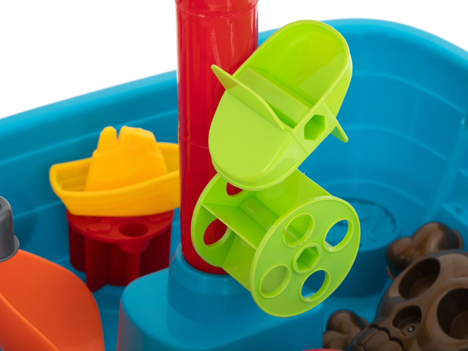 Пясъчникът е оборудван с множество допълнения, включително форми, оръдия и малки лодки, които дават на децата безкрайни възможности за игра и строене.