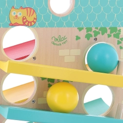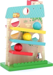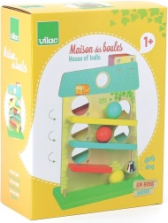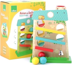 Дървената каскадна къщичка VILAC ще очарова малките деца със забавното движение на топчетата и приятния дизайн. Тя предлага 3 рампи от двете страни, по които дървените топчета се търкалят отгоре надолу и при пристигане в края звъни метално звънче. Играчката в пастелни цветове развива сръчност и логическо мислене и осигурява часове радостна игра.