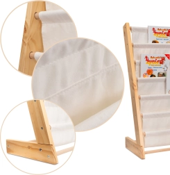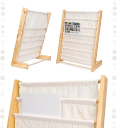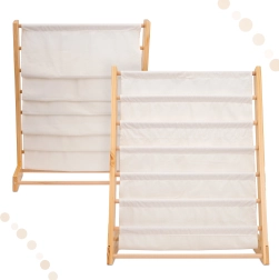 Стилен детски рафт в стил Монтесори с текстилни джобове осигурява лесен достъп до любимите книжки, подредено съхранение и безопасна употреба. Естественото дърво и висококачествената памучна тъкан създават издръжлива и вечна мебел, която насърчава самостоятелността на детето и създава ред в детската стая.