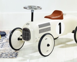 Стилна детска проходилка с вид на състезателен автомобил впечатлява с ретро чар и качествена метална изработка. Предлага тихо движение благодарение на гумираните колела, лесно управление с волан и здрава конструкция с товароносимост 20 kg – идеална за малки състезатели от 1,5 години.