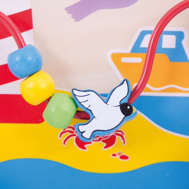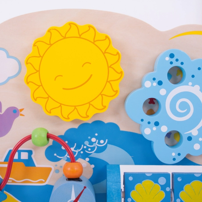 Тази дървена активна дъска с морски мотив предлага на децата пъстра палитра от дейности: въртящ се лабиринт, ротиращи морски кончета, плъзгащи се рибки и тел с мъниста и чайки. Всеки елемент е проектиран да подкрепя естественото развитие на уменията, търпението и концентрацията. Благодарение на регулируемите захвати дъската може безопасно да се закрепи и към кошарата, за да има бебето стимулираща игра на една ръка разстояние.