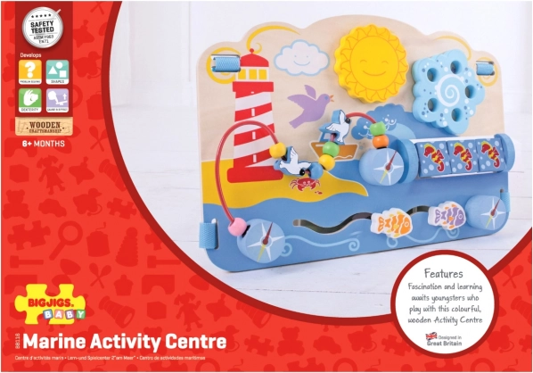 Открийте забавна и безопасна играчка за най-малките – дървена моторна дъска с морски мотив, която развива фината моторика, сетивното възприятие и координацията око-ръка. Благодарение на регулируемите захвати лесно я прикрепяте дори към кошарата. Цветните елементи, като въртящи се морски кончета, лабиринт с топчета и плъзгащи се рибки, ще заинтригуват деца от 6 месеца. Изработена от качествени и отговорно набавени материали, отговаря на европейските стандарти за безопасност.
