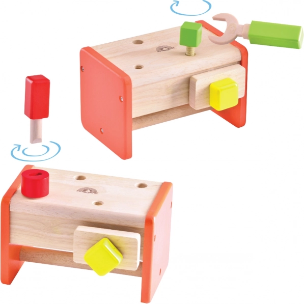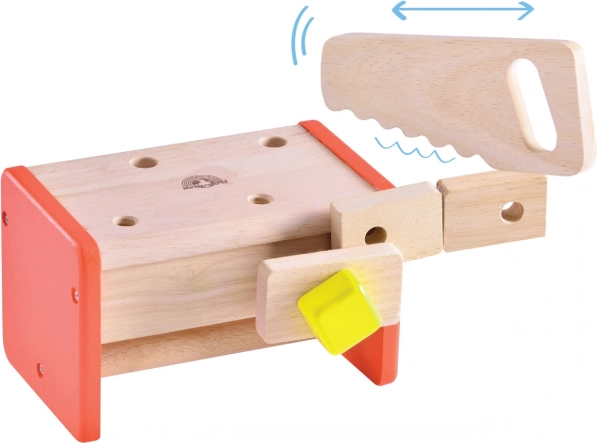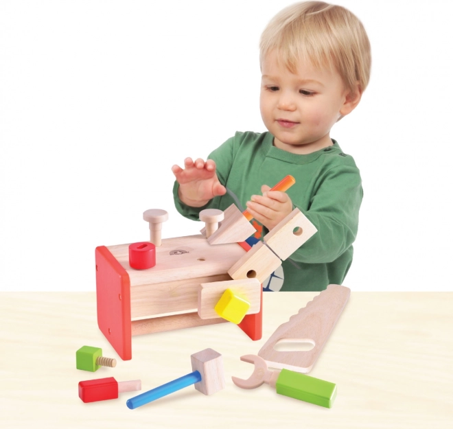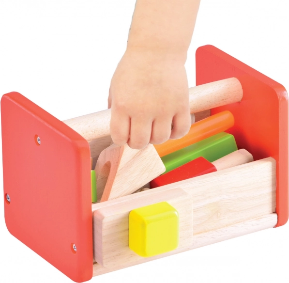 Комплектът е изработен от издръжливо масивно дърво и дървесно-пластмасов композит, което гарантира дълъг живот и безопасност при игра. Атрактивната комбинация от естествен вид и наситени цветове привлича погледа на всяко дете. Децата се учат да сортират инструментите според предназначението им, а благодарение на компактната конструкция се пести място.