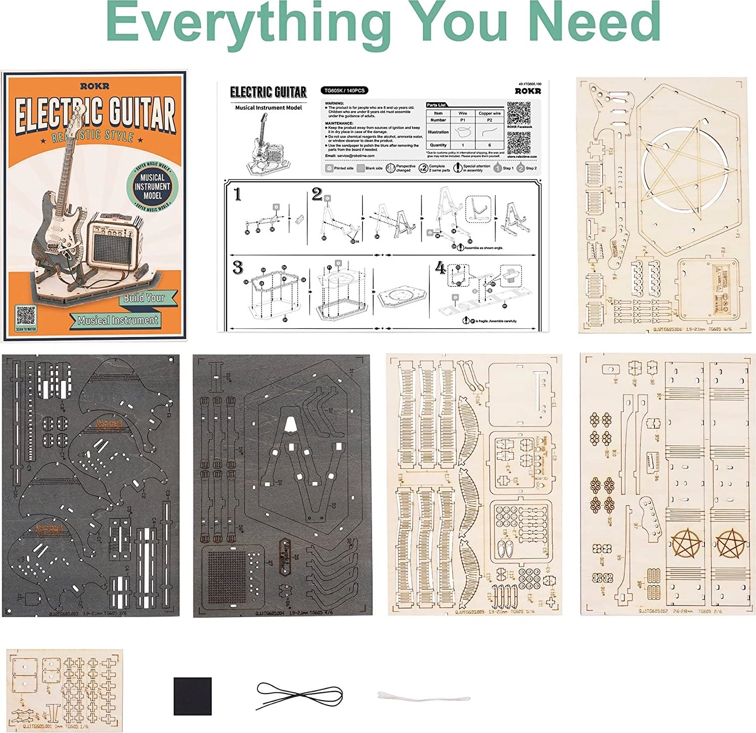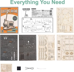 Комплектът съдържа 140 части с ниска трудност, което го прави чудесен избор за начинаещи и по-големи деца. Благодарение на ясните инструкции ще сглобите китарата за приблизително 1,5 часа. Резултатът е реалистичен модел на електрическа китара с усилвател – страхотен подарък за музикални ентусиасти.