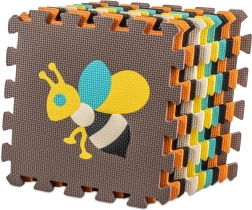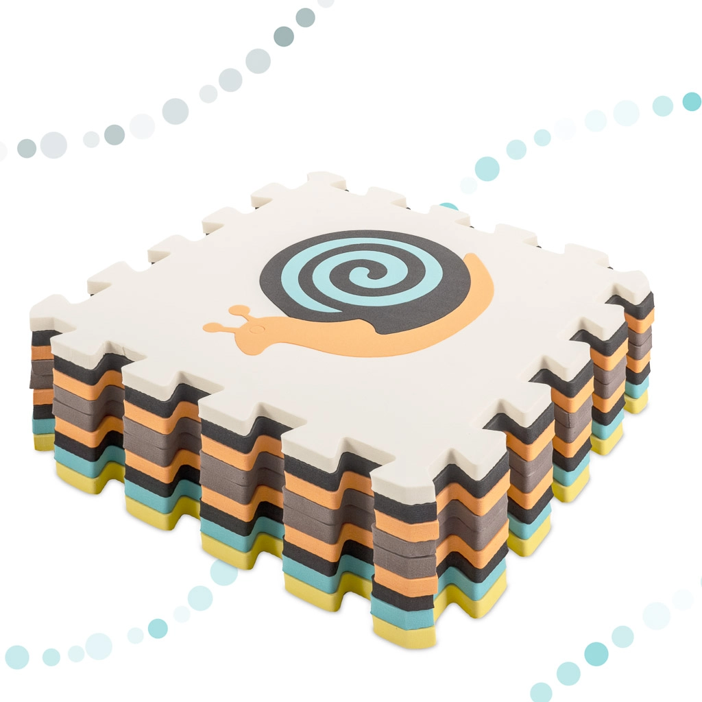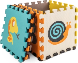 Тази голяма пенена постелка се състои от 9 части с размер 30 × 30 × 1 см, които лесно се свързват една с друга. Контрастните цветове и сладките мотиви с животни привличат вниманието на децата и стимулират зрението и допира. Изваждаемите централни елементи действат като прост сортер – децата се учат да разпознават формите и да ги поставят на правилното място.