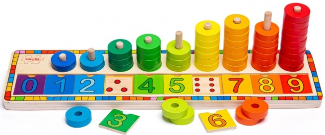 Числовите редове 0–9 и подреждането на пръстени насочват децата към естествено разбиране на количества, ред и основите на броенето.