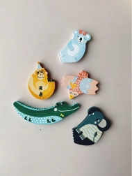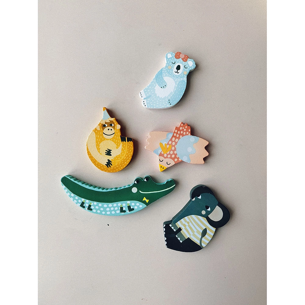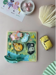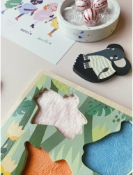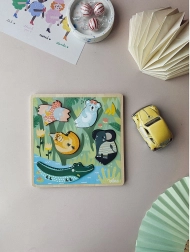 Дизайнът на Michelle Carlslund в нежни пастелни тонове придава привлекателен вид и стимулира въображението. Дървената основа с изрязани форми и животински мотиви учи децата да съчетават форми, да разпознават цветове и животни. Пъзелът е издръжлив, безопасен и изработен от висококачествено дърво в комбинация с текстил.