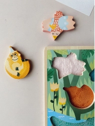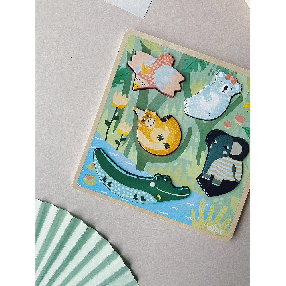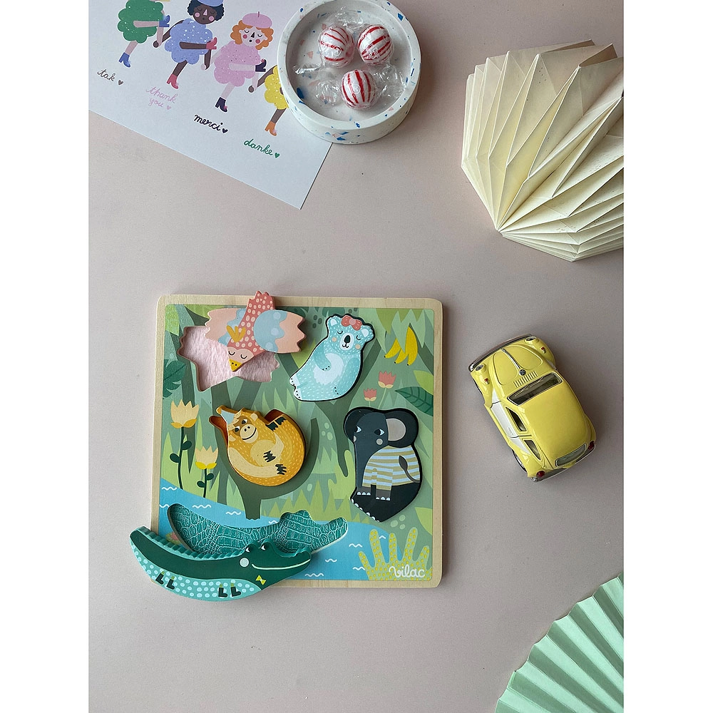 Открийте магията на сетивната игра със сетивния дървен пъзел Jungle от марката VILAC, илюстриран от Michelle Carlslund. Всеки от 5-те животински елемента крие отдолу различна текстура на плат, която подпомага развитието на сетивата, фината моторика и възприятието за форми. Идеален първи пъзел за малки изследователи.