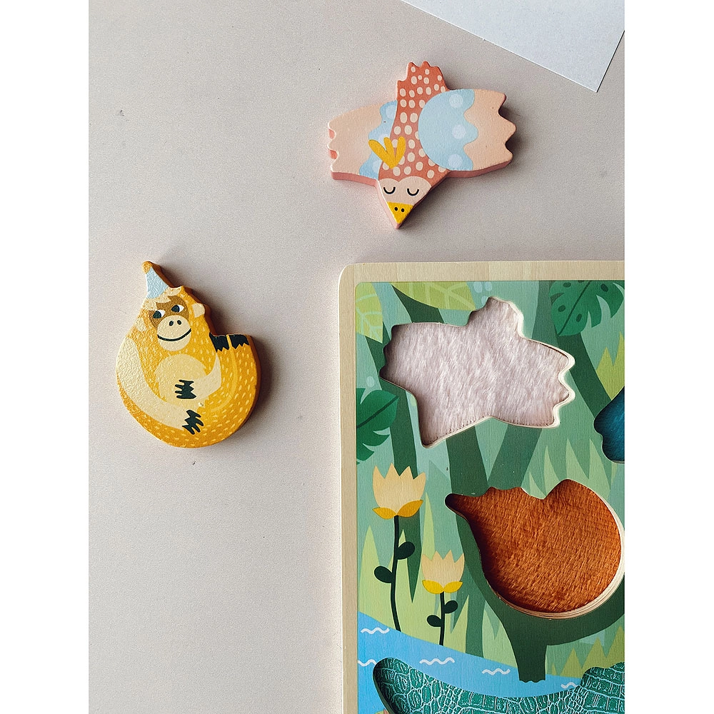 Този качествен дървен пъзел носи на децата радост от откриването и ученето. След изваждане на всяко животинче под елемента ще открият различна повърхност за допир – мека, грапава или релефна, която естествено развива осезателните усещания и подпомага сетивната интеграция. Здравите, лесни за хващане части прилягат отлично в малките ръчички.