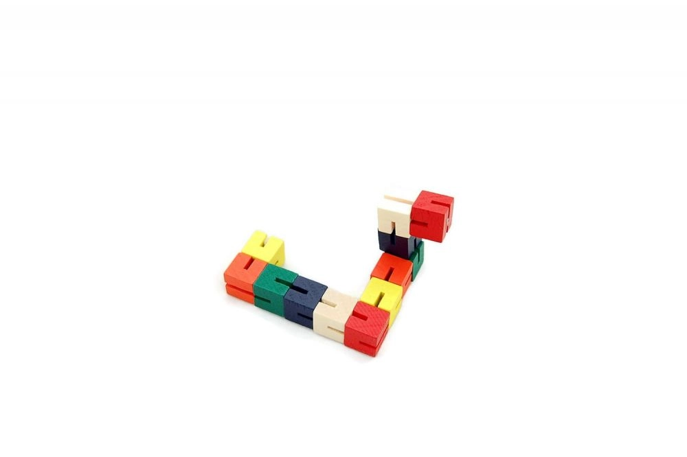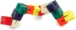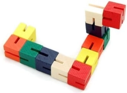 Цветната дървена главоблъсканица във форма на змия предлага безброй начини децата да изследват своята креативност. Чрез завъртане и прегъване на отделните сегменти те развиват сръчност и фина моторика. Играчката е идеална и за път, благодарение на компактния си размер децата могат винаги да я имат под ръка. Дървените кубчета са здраво свързани с еластична гума, което гарантира издръжливост и безопасност.