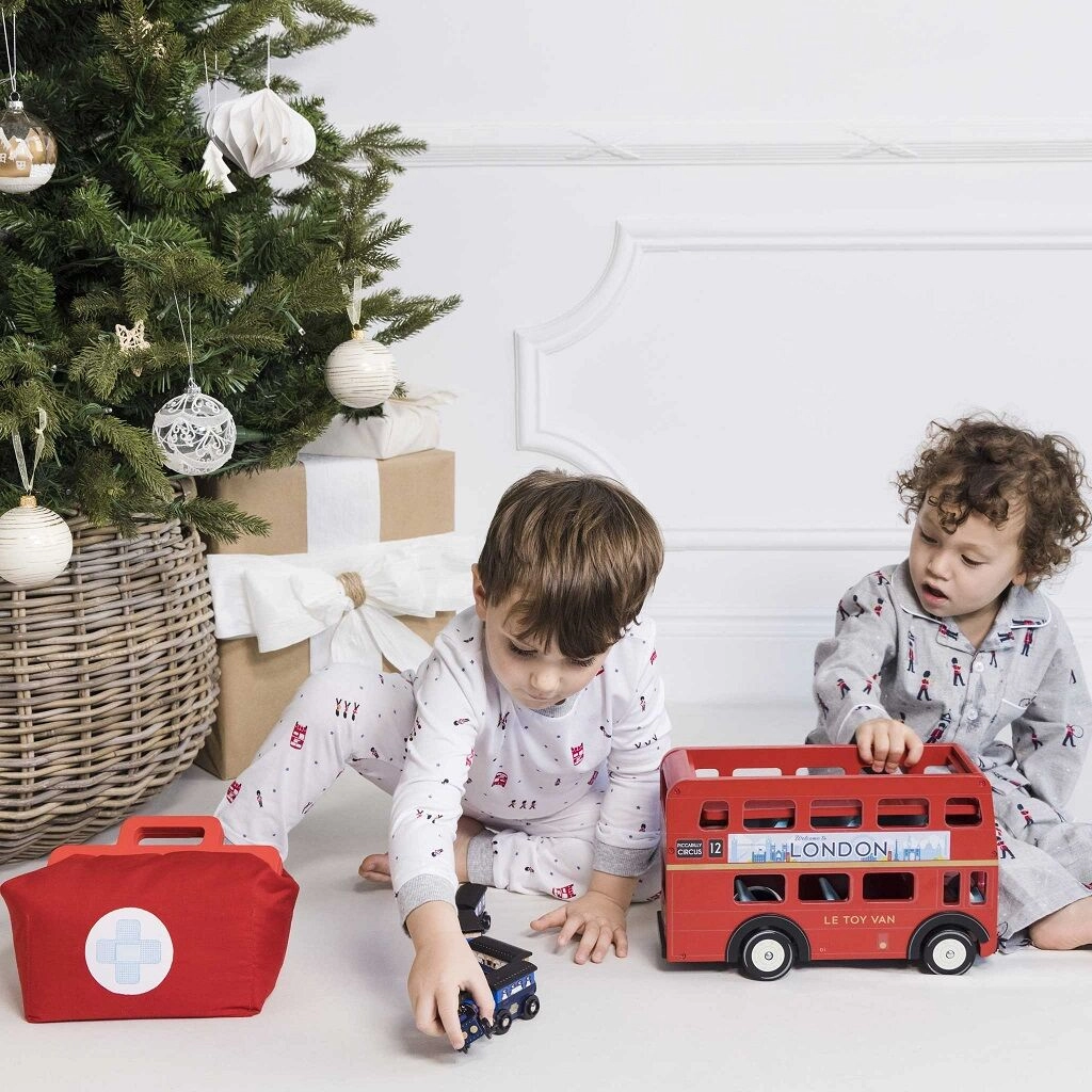 Стилен докторски комплект за малки лекари в текстилна чанта с дървени дръжки носи всичко необходимо за игра на кабинет. Съдържа общо 10 части, включително стетоскоп, термометър и спринцовка. Играчката е неутрална по отношение на пола, подпомага фината моторика, въображението и когнитивните умения. Изработена е от устойчива дървесина с FSC сертификация и ръчно дооцветена с нетоксични бои на водна основа.