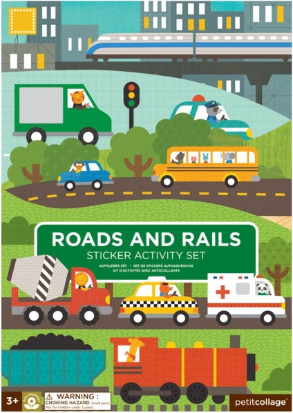 Този комплект от PETIT COLLAGE предлага голяма разгъваща се сцена с игриви илюстрации от двете страни и повече от 100 хартиени стикера, които могат да се преместват отново и отново. Децата създават собствени истории от света на пътищата и строежите, развивайки фантазия, фина моторика и търпение.