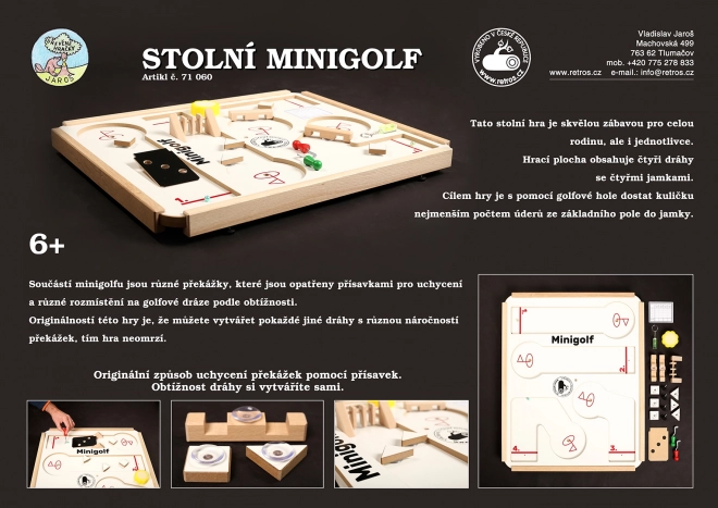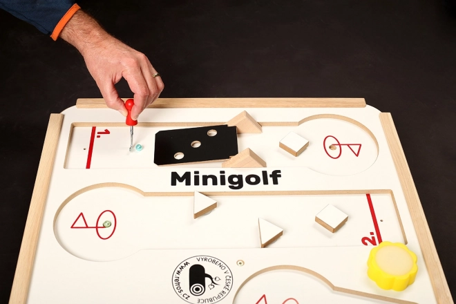 Настолният миниголф предлага оригинално забавление за деца и възрастни. Четири писти с препятствия на вендузи позволяват свободно разположение и безкраен брой комбинации. Всяка игра е различна, тренира наблюдателност, търпение и фина моторика. Благодарение на здравите материали е идеален за честа игра у дома и в училища.