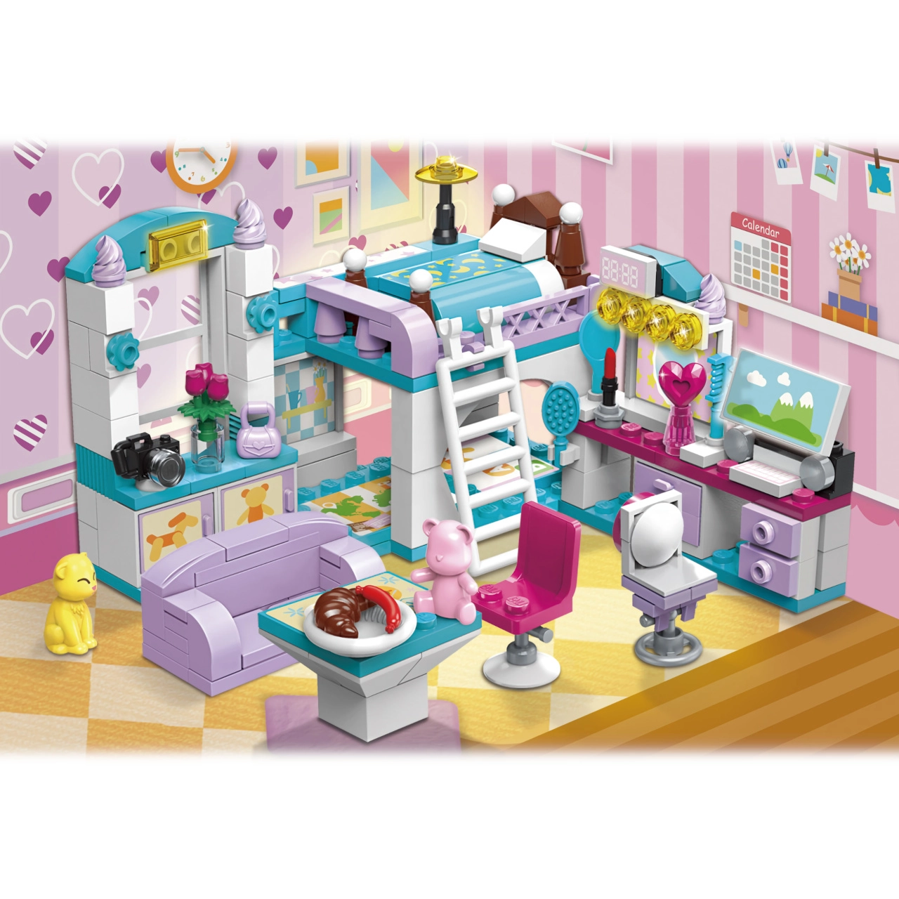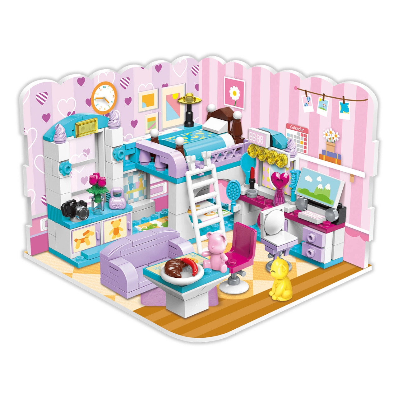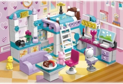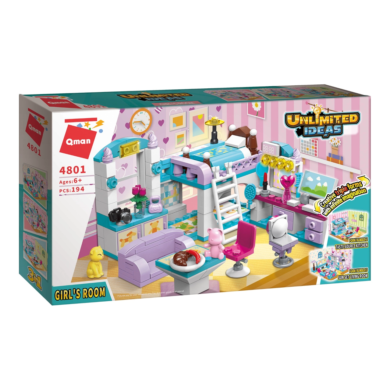 Конструкторът QMAN Момичешка стая 3 в 1 предлага на децата безкрайни възможности за строене и истории. От един сет създавате цяла стая с двуетажно легло, бюро и декорации или я преобразявате в уютна всекидневна или трапезария. Пъстрите цветове и детайлните аксесоари вдъхновяват за дълга, креативна игра.