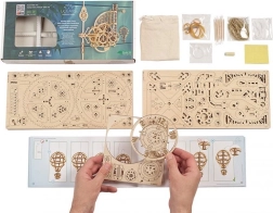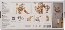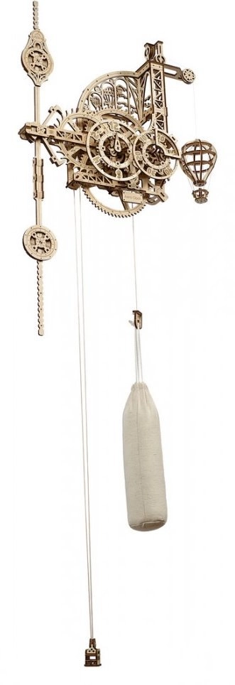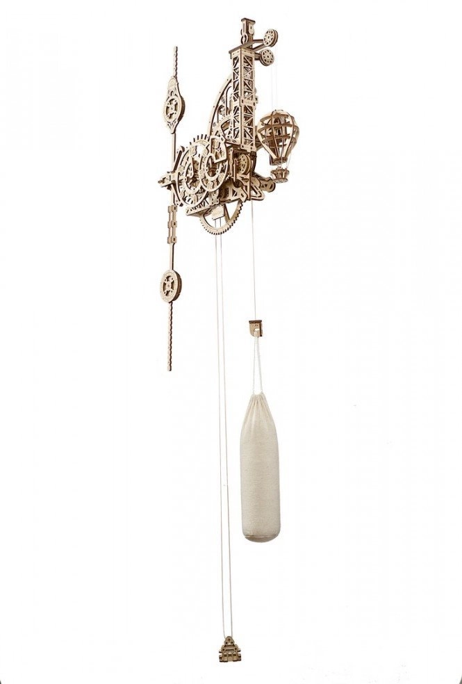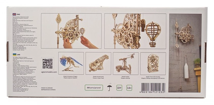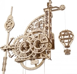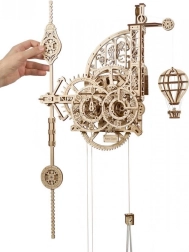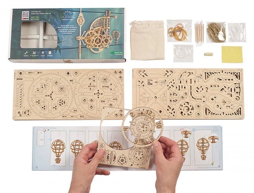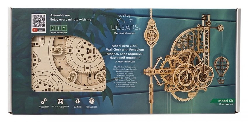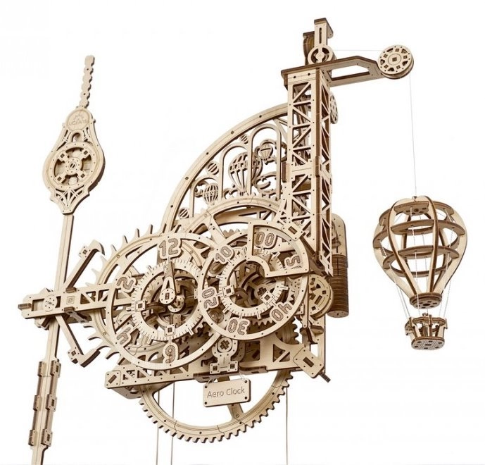 Ugears Aero са стенни механични часовници от висококачествен шперплат, които сглобявате самостоятелно без лепило. Завладяващият поглед към разкрития часовников механизъм с махало и тежест предлага уникално изживяване с прецизното инженерство. Времето се отчита от двойка циферблати, въртящи се обратно на часовниковата стрелка, докато декоративният модел на въздушен балон ритмично се издига и при всяка пълна час спускайки се, дава визуален сигнал.