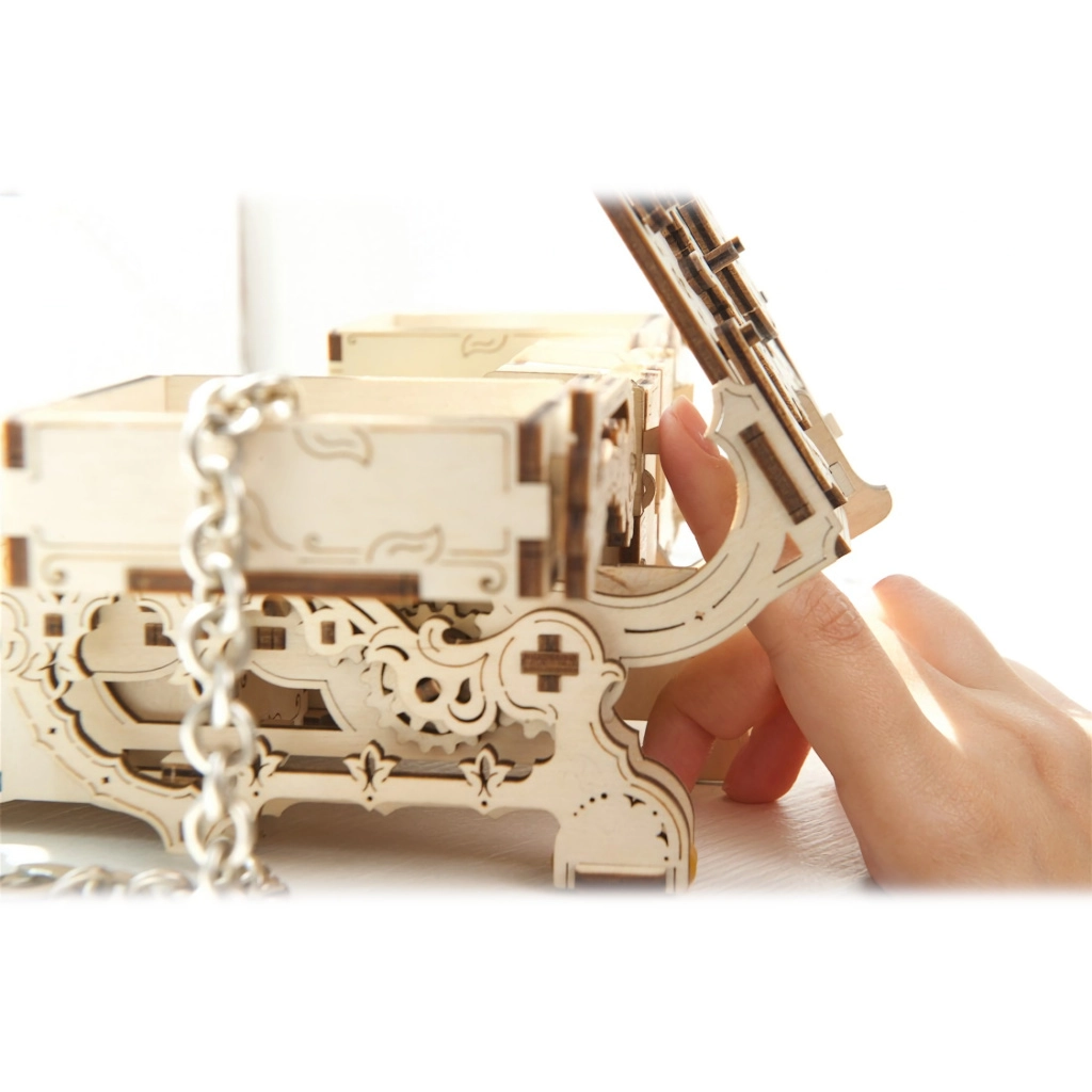 Тази оригинална кутия за бижута в античен стил съчетава прецизно лазерно изрязване с интелигентна механика. След сглобяване получавате функционална кутия с предавки и подвижни части, която впечатлява от пръв поглед и надеждно съхранява вашите ценности. Изживяването при строежа е забавно и поучително – без лепило, само с прецизно пасващи части от качествен шперплат.
