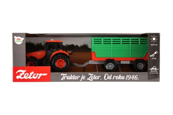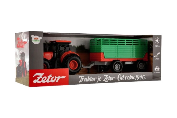 Този детайлно изработен пластмасов трактор Zetor с каруца е чудесен избор за деца от 3 години. Благодарение на инерционния механизъм тръгва лесно, бутоните активират реални звуци на мотор и светлини за по-автентична игра. Откачащото се ремарке позволява превоз на сено, животни или други товари и развива детското въображение при фермерски сценарии.