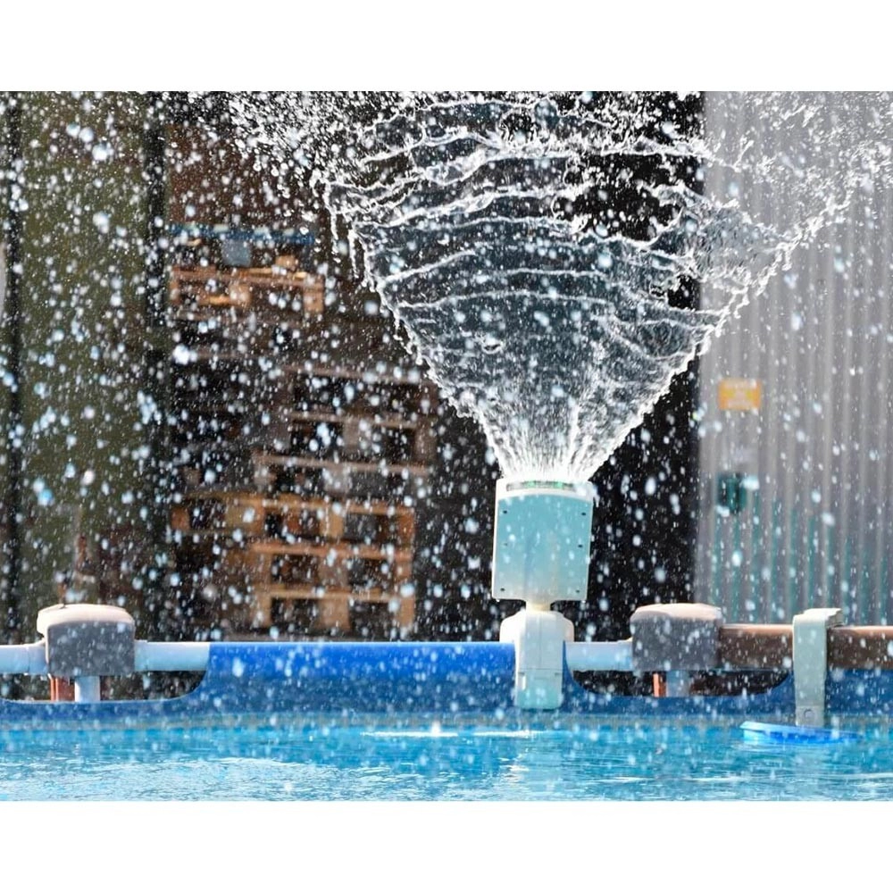 Монтажът е за минута: просто закрепете фонтана към стената на басейна без пробиване и без инструменти. Универсалното захващане и включеният адаптер позволяват лесно свързване към стандартни маркучи 32/38 mm и към филтрации с дебит 3 785–12 112 l/h. Продуктът отговаря на европейските стандарти за безопасност.
