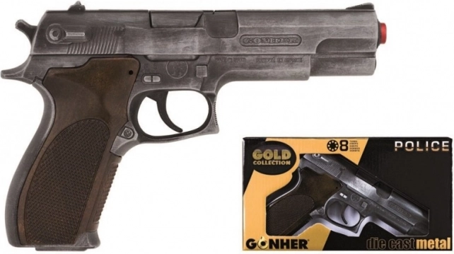 Стилен полицейски пистолет от изданието Gold Edition в елегантно сребристо метално изпълнение за капси 8 изстрела. Страхотен избор за детски игри на полицаи и за колекционери, които ценят качествената изработка и автентичния вид.