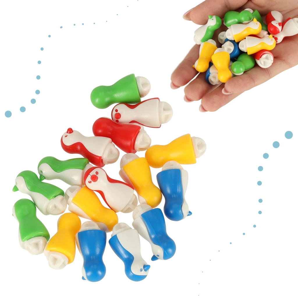 Комплектът съдържа 16 фигурки пингвини в четири цвята – син, жълт, зелен и червен – за ясна и забавна игра.