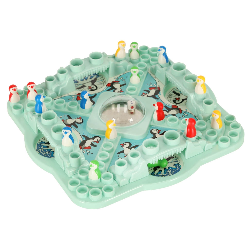 Тръгнете с децата на ледена експедиция! Състезанието на пингвини е модерна вариация на класическото „Не се сърди човече“, обогатена с хитро измислени капани и мостове, които правят всяка партия различна. Pop-o-matic зарът в прозрачния купол осигурява бързо хвърляне без търсене на зара под масата.