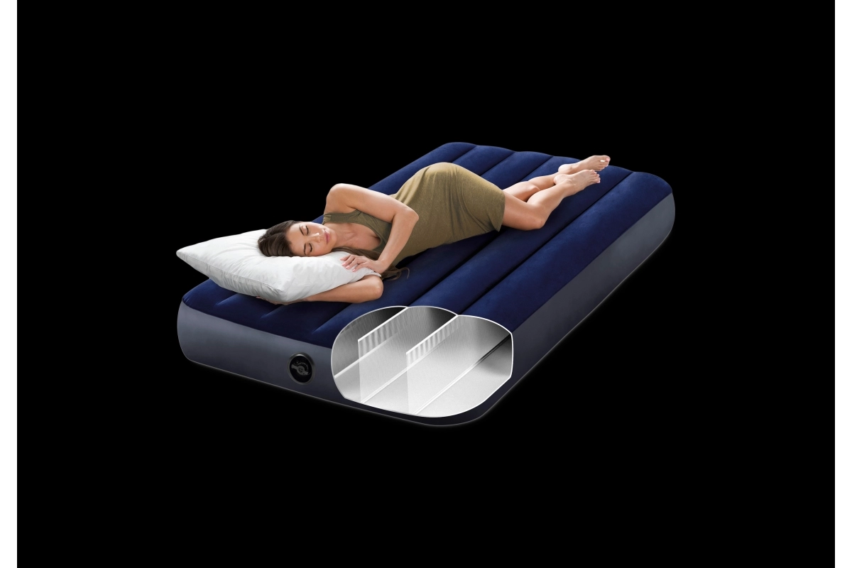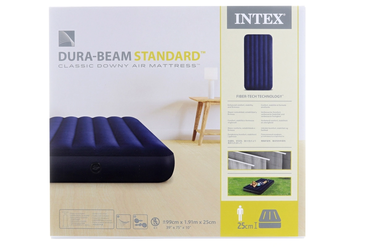Насладете се на спокоен сън навсякъде благодарение на матрака INTEX с височина 25 cm за удобно лягане и лесно ставане. Конструкцията с Dura‑Beam Fiber използва хиляди здрави влакна, които повишават стабилността и устойчивостта срещу провисване. Приятната велурена повърхност е мека на допир и е водоотблъскваща, което улеснява поддръжката.