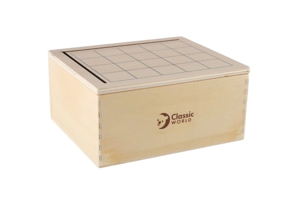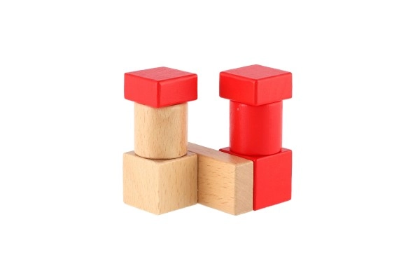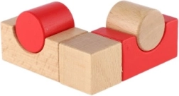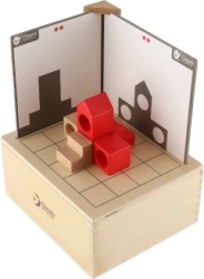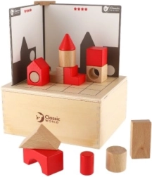 Комплектът е създаден за деца от 3 години, а всички елементи са безопасно съхранени в дървена кутия с размери 18,5 x 16 x 9 см. Децата могат да се опитват да подреждат блоковете по картите и да съчетават двете страни, с което тренират логика и сръчност.